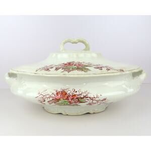 This antique covered vegetable bowl from John Maddock & Sons is a beautiful example of Royal Vitreous Semi Porcelain ironstone, made in England likely between 1880 and 1910. Featuring a delicate red floral transfer design accented with soft green leaves and subtle embossed details around the handles and rim, this lidded bowl makes a charming addition to a Victorian-style tablescape or collectible ironstone display.