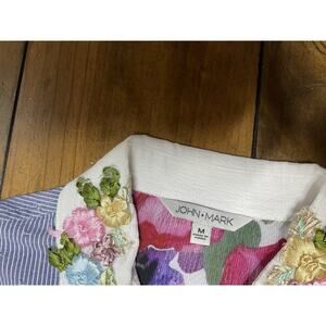 The John Mark Blue Floral Trim Striped Chambray Shirt Tunic Dress in size Medium is a stylish and versatile piece perfect for various occasions such as travel, casual outings, or business meetings. Made from 100% cotton chambray fabric, this knee-length dress features a collared neckline, sleeveless design, and button closure. The floral trim adds a touch of femininity to the classic striped pattern in shades of blue, making it a great choice for the spring and summer seasons. Easy to care for with machine washable instructions, this shirt dress from John Mark is a must-have for any woman's wardrobe.pre owned good condition we ship fast measurements are in the pictures