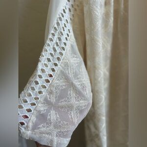 This cream blouse by John Mark features a relaxed fit with flutter sleeves and a stylish tie front. The airy fabric and intricate detailing across the upper chest add a touch of elegance to this versatile top, making it perfect for casual or bohemian-inspired outfits.