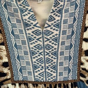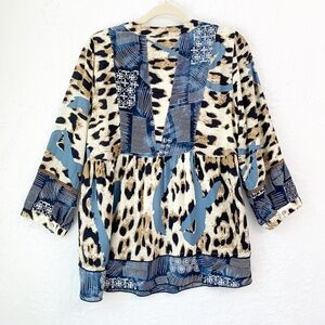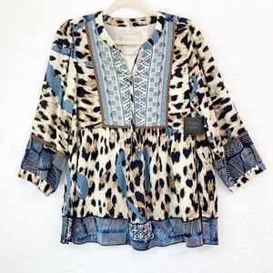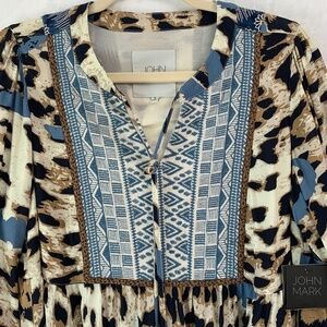 John Mark Embroidered Animal Print Tie Neck Tunic Top Sz S