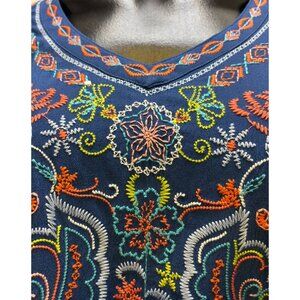 This embroidered blouse by John Mark features intricate designs on a rich blue backdrop. Its relaxed fit offers comfort while maintaining an elegant appearance. The vibrant embroidery adds a touch of bohemian flair, making it a versatile piece for work or outings.