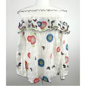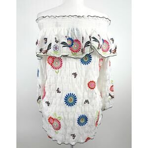 John Mark Embroidered Floral Boho Crinkle Strapless Ruffle Top White Size Large