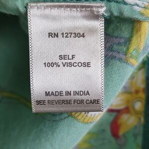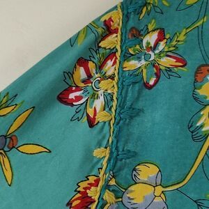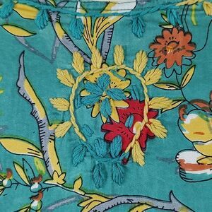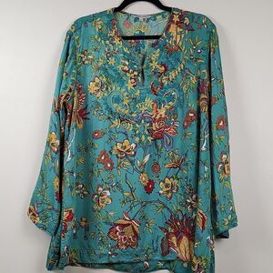 John Mark Embroidered Floral Roll Tab Sleeve Tunic Blouse. This turquoise floral blouse has a split neck with a keyhole closure, 3/4 length roll tab sleeves and a soft viscose fabric. Size Large.