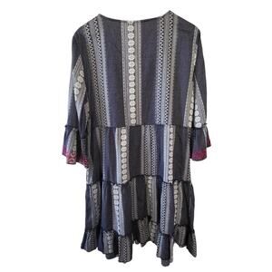 This 3/4 ruffle sleeve dress hits at about the knee and is features tribal embroidery and a jacquard print.