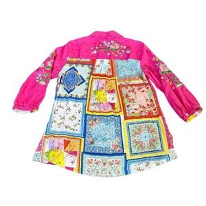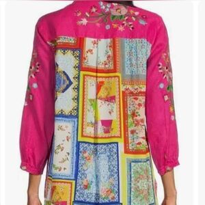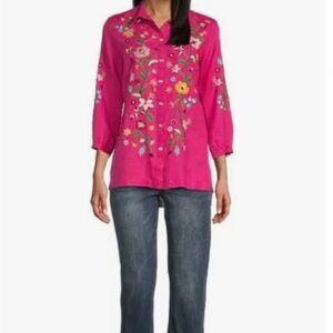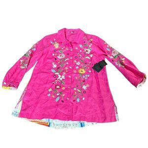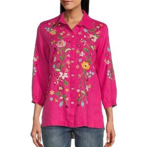 John Mark Embroidered Floral Linen Shirt 3/4 Sleeve Pink Multi Spring Summer New