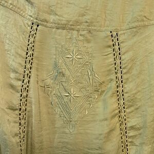 This is a preowned flowy polyester top with all over embroidery. It has a petal hem and lace detail sleeves. No holes or stains some of the embroidery has loose threads.