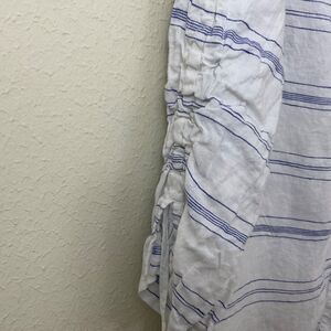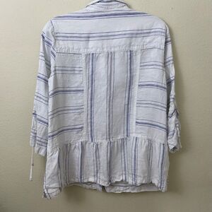 John Mark Linen Blouse Top Shacket Women's Size Med. Striped blue shirt peplum hem w rushed sleeves.