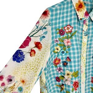 This vibrant button-down from John Mark features a cheerful blend of blue plaid and floral patchwork with stunning embroidery. Crafted with a linen front and ultra-soft printed rayon-viscose sleeves and back, it offers a unique fusion of texture, color, and artisan detail. A must-have statement piece for creative wardrobes and eclectic layering.