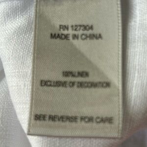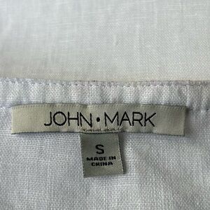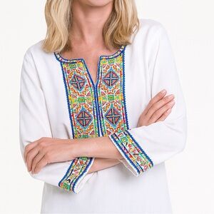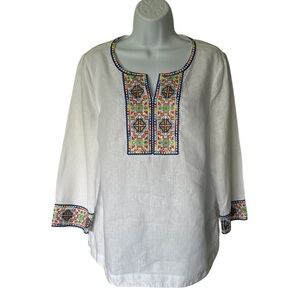 John Mark tunic in crisp white with vibrant multicolor embroidery and sequins. Split v neck. 3/4 sleeves. Split sides. 100% linen. Machine wash. Bust 20” length 27”. Excellent condition. Size S