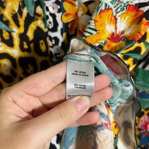 Vibrant button down with floral and animal patterns. Eye-catching design. Perfect for bold style.