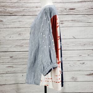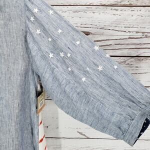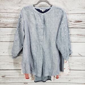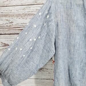John Mark Women's Blue Haze with Stars Embroidery Contrast Back Detail Oversized, Relaxed fit Top Blouse Size Small. Self 100%Linen. Combo 1and 2 100%Viscose. Approx. measurements pit to pit 20.5 in. Sleeve length 16 in. Top length 26.5 in. New with tags in excellent condition. no holes or stain.