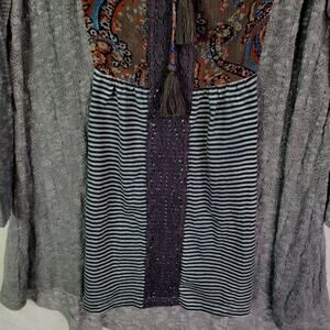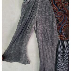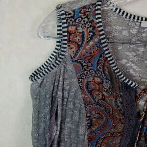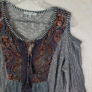 John Mark Paisley Cold Shoulder Top Women XL Gray Boho Retro Cottagecore Tassels