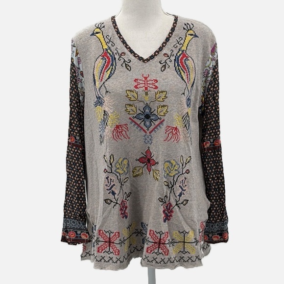 John Mark Peacock Cross Stitched V Neck Long Sleeve Blouse - Size Small. Excellent, like new condition. Zero signs of wear. Absolutely gorgeous! Body is a french terry fabric with cross stitched peacocks and florals. Gray with multi-colors. Long sleeves with button cuffs, V neckline, raw straight hemline with side splits. Approximate measurements: 20" pit to pit, 27" length.