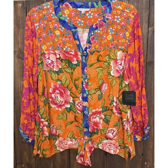 John Mark Plus Top 2X Split V Neck 3/4 sleeve Tie Front Orange Floral NEW $109