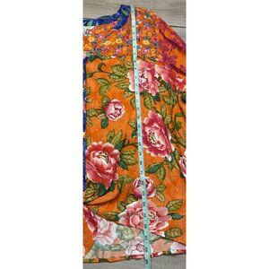 • Vibrant Mixed Print: A bold and beautiful combination of floral and paisley prints in hot tropical colors. The main body features large pink and white flowers on a bright orange background.