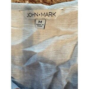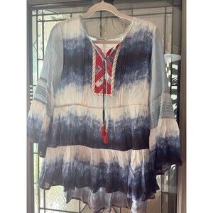 Sleeve Length: John Mark peasant blouse in size Medium. Featuring a striking blue and white tie-dye wash with bold red embroidered accents and a tassel tie front, this piece captures a true 70s hippie festival vibe. The cotton blend fabric is lightweight and breathable, perfect for layering or warm-weather wear.