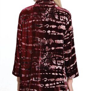 Keywords: Velour Shibori Tye Dye Dyed Lagenlook Layer Layering Tunic Long Line Coastal Contemporary Feminine Plush Soft Elegant Luxe Luxury Figure Skimming Flattering Classic Basic Capsule Staple Over Size Sized Roomy Relaxed Fit Red Wine Bordeaux Eggplant Plum Burnout