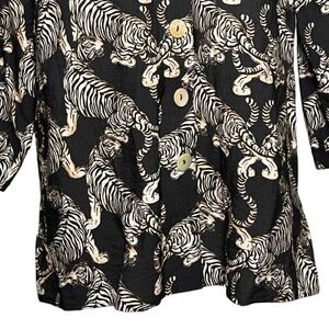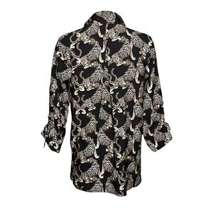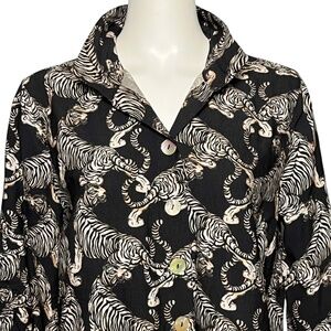 John Mark Tiger Print Wire Collar Cinch Tie Sleeve Button Front Black Top Size M