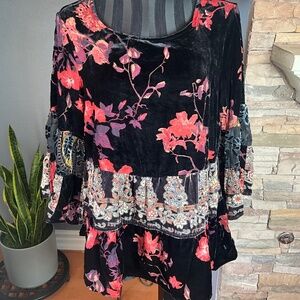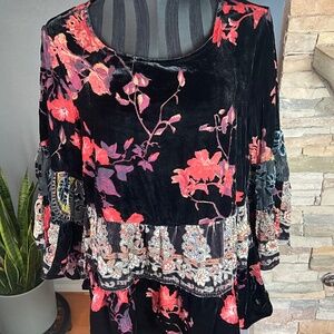 John Mark Soft Velvet Dark Floral Popover Blouse Top, Gorgeous Dark Floral, 3/4 Partial Sheer Bell Sleeves, Mixed Media Print, Tiered, Boho, Hippie, Whimsigoth, Dark Floral, Dark Romance
