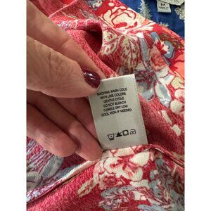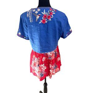 John Mark Women Chambray Blue Red Floral Embroidered Linen Cottage Peasant Top M