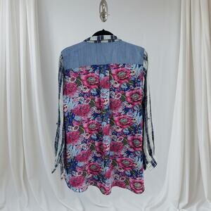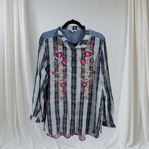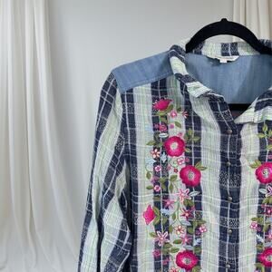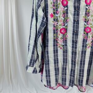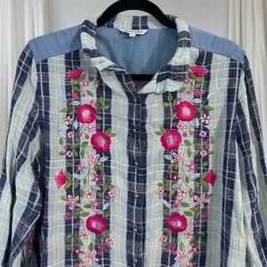 John Mark Womens Floral Embroidered Button Up Gauze Shirt Boho Size M Plaid
