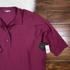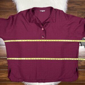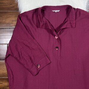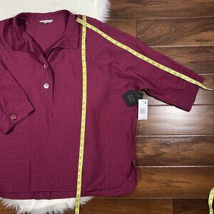 John Mark Women's Plus Size 2X Wine Popover Tunic Top, No Stretch, Partial Button Front, 85% Rayon 15% Nylon, Button Cuff Sleeves, Collared Neckline with Boning, Pleated Detail On Back