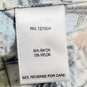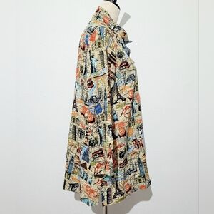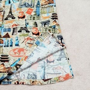 Add a touch of wanderlust to your wardrobe with this vibrant John Mark women’s button-front shirt, size Medium. Featuring a colorful allover travel-themed print with iconic landmarks like the Eiffel Tower, Big Ben, Statue of Liberty, Colosseum, and more, this lightweight top is perfect for casual wear or vacation style. Made from a soft, breathable blend of 85% rayon and 15% nylon, it offers comfort with a relaxed fit and 3/4 sleeves.