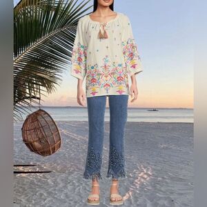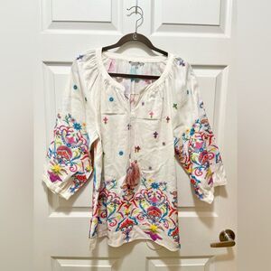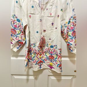 John Mark Womens Tunic Top Floral Embroidered Tassel Linen Size M Split Neck NWT