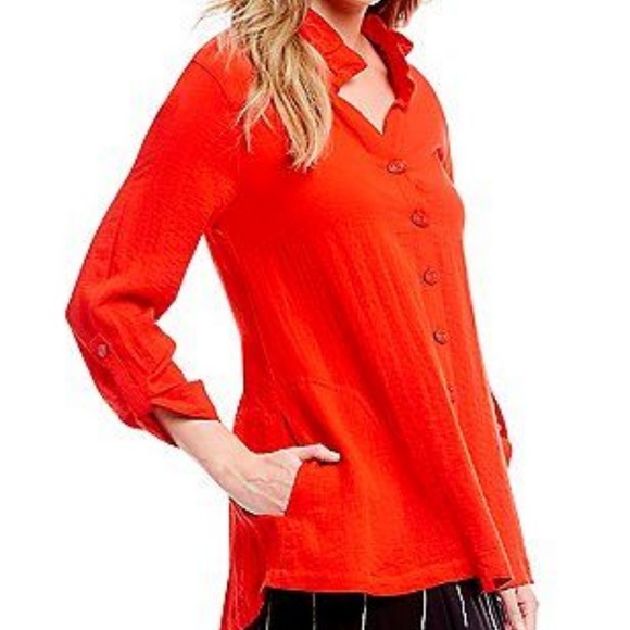 Tomato red tunic with tab sleeves and cute oblong buttons rayon nylon blend