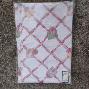 Elegant John Matouk luxury round tablecloth, new with tags and never used. Made in the USA from 100% cotton, featuring a refined pink ribbon lattice with pastel wrapped-gift motifs — a timeless design for upscale dining and holiday entertaining.