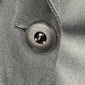 blazer jacket; herringbone pattern; single button closure; black white but looks gray.