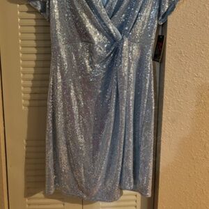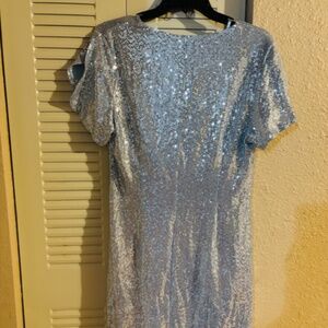 Women’s Dress: V neckline, pullover, twist front accent, elasticized waistline, sequins, sparkly, stretchy, and short slit sleeves. New with tags. Wear it with your favorite flats or heels!