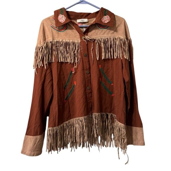 John Moon Shirt Women Medium Brown Texas Western Floral Fringed Cowgirl Rodeo