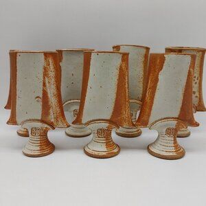 This vintage pottery set includes a beautifully crafted brown and beige clay carafe with a cork lid, accompanied by seven matching wine cups. Ideal for collectors or those who appreciate timeless, artisan pottery.