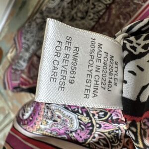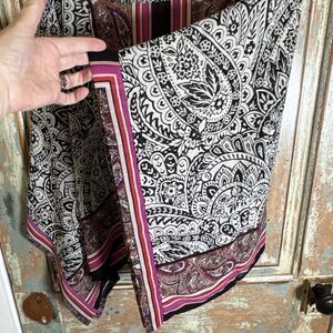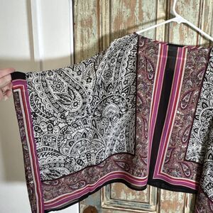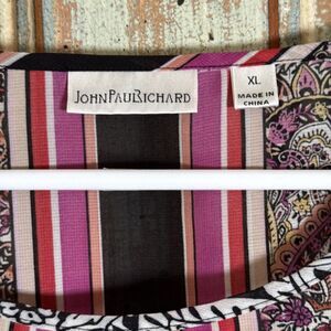 John Paul, Richard scarf style poncho/blouse size XL. This blouse is colorful, and visually striking. It has a Boho, floaty, yet sophisticated feel. Perfect blouse for summer, will take you from work to happy hour. Easy to dress up or dress down. The colors are lovely. Please see photos for details, I see no flaws. I see no evidence this blouse has ever been worn. Measurements: this top is poncho style, but has small side seams that laid flat, measure about 25.5 inches across. From the top shoulder seam to the hemline is about 22 inches.