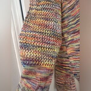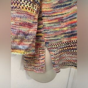This eye-catching John Paul Richard sweater features a vibrant multicolor knit pattern, perfect for adding a playful touch to your wardrobe. Crafted from 100% acrylic, this lightweight sweater offers a relaxed fit with side slits for added comfort and style. The airy design makes it ideal for layering during transitional weather, and the open-knit detailing on the sleeves adds a unique, textural element. There is a minor flaw at the hem where a small section of the knit has come undone, as shown in the pictures, but the sweater remains in excellent wearable condition. This fun and versatile piece is great for casual outings and everyday wear.