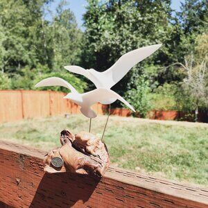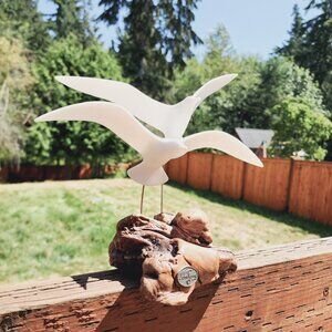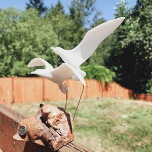 John Perry 2 SEAGULLS IN FLIGHT Polymer Sculpture on Burl-wood Base MCM Danish