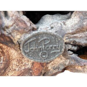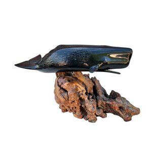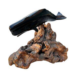 John Perry Black Sperm Whale Sculpture On Driftwood Base 8” T