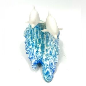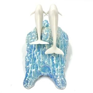 This exquisite John Perry Design Dolphins on Blue Wave Sculpture, created in 1999 and signed by the artist, is a must-have for any collector of marine life figurines. Crafted from high-quality resin, this sculpture captures the grace and beauty of dolphins in motion as they ride a wave of blue.-