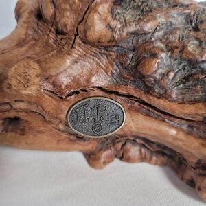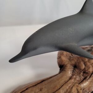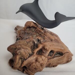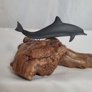 John Perry Gray Dolphin Figure on Burl Driftwood. Approximately 5" tall by 9" long. Dolphin is approximately 7". In great preowned condition. No scratches or chips. Great collectors piece.