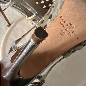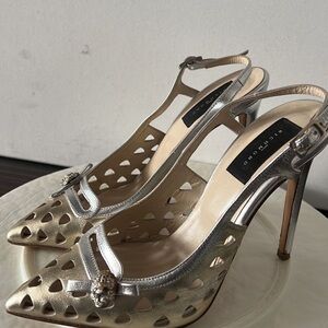 These stunning stiletto heels feature a captivating cutout pattern, adding a touch of elegance to their gold and silver finish. The high, slender heels and pointed-toe design make them a perfect choice for a sophisticated look. A thin ankle strap ensures a secure fit, making these heels both stylish and comfortable.