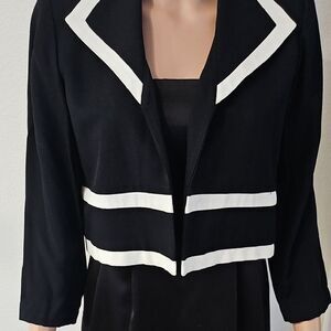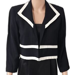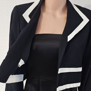 This sophisticated blazer features a classic silhouette with striking white contrast details, including lapel outlines and nautical-inspired stripes. Crafted from a structured fabric, it offers a versatile style suitable for both professional and dressy casual occasions.