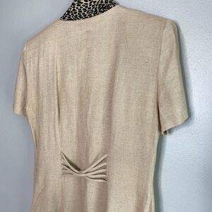 This is a beautiful linen blend dress by the brand John Roberts in a size 6. The dress features short sleeves, a V-neckline, a button front closure, shoulder pads, and animal print scarf. It has a solid pattern and a midi dress length. The dress is lightweight and perfect for various occasions such as travel, holy communion, parties, casual wear, workwear, and business attire. The fabric type is woven and the dress is perfect for those who love a classic and timeless style.