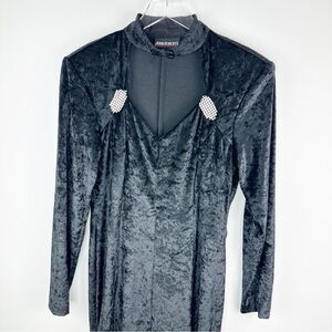 Whether you are going for a moody, retro goth vibe, channeling Stevie Nicks or looking for an awesome dress for your Halloween costume, this vintage dress is perfect. Long sleeved pull-over style with rhinestone brooches anchoring a modest cut-out neckline. Back tie helps adjust sizing and adds flattering waistline. shoulder pads.