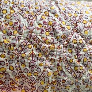 Floral design. Lavender, gold, maroon, and white colors. The backside has a lavender/white strip. The fabric is very soft 100% cotton.