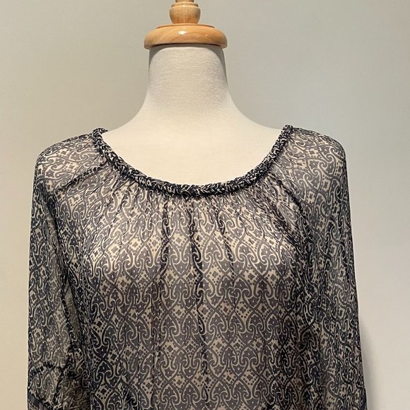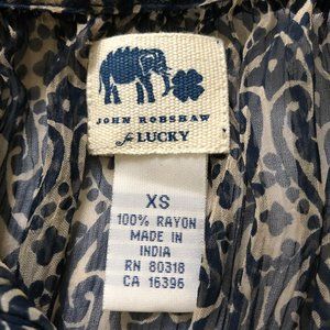 John Robshaw for Lucky Peasant Blouse. Blue and tan print, rouched neckline and draw string (with side bow) waist. 100% rayon, sheer fabric. Looks very cute with camisole. In excellent condition.