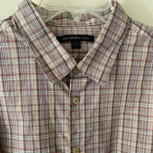 Wonderful JV cotton, button down shirt with collar and double button cuffs. Has rounded hem and subtle lines of color: blue, gray and soft rust; buttons are beige.