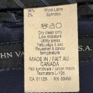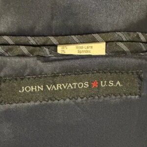 Sophisticated blue suit by John Varvatos. Ideal for formal events. Timeless elegance and style. Jacket is 42R, pants are 33”x30”.