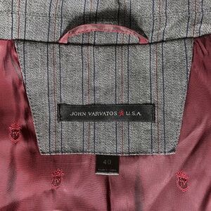 The John Varvatos Finley Skull Jacket in size 40 is a stylish and sophisticated blazer designed for casual occasions. Featuring a pinstripe pattern, button closure, and a sleek gray color, this jacket is perfect for the winter, fall, and spring seasons. Made by the renowned brand John Varvatos, the jacket showcases a unique skull theme, adding a touch of edgy flair to a classic design. With a regular fit, double vent and three-button sleeves, this jacket is a versatile and fashionable addition to any man's wardrobe. Excellent condition as shown in the photos.