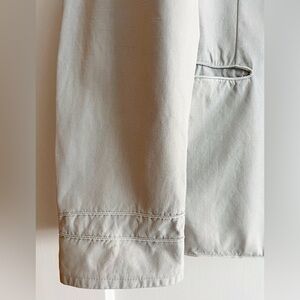 John Varvatos Runway Collection men’s military inspired sportcoat/jacket. 76% cotton/24% linen in light seafoam green color with white cord piping around collar, hems and at sleeves. Single vent in back and sleeves and top lined in cotton. Two front pockets and interior pockets. Made in Italy. Excellent condition, only worn a few times.